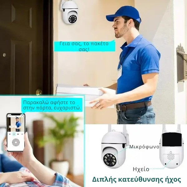 Η κάμερα ασφαλείας εξωτερικού χώρου διαθέτει ενσωματωμένο μικρόφωνο, το οποίο σας επιτρέπει να λαμβάνετε ήχο και να μιλάτε μέσω της εφαρμογής μας.  Ο αμφίδρομος ήχος σάς επιτρέπει να επικοινωνείτε με τους καλεσμένους σας, ενώ το σύστημα ανίχνευσης κίνησης σάς βοηθά να απαλλαγείτε γρήγορα από ανεπιθύμητους επισκέπτες ή ζώα.