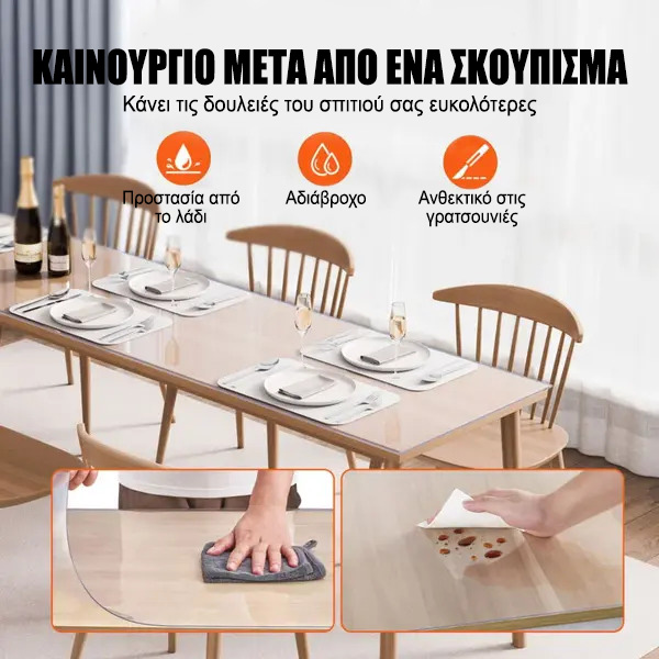 Αναβαθμίστε τον χώρο της τραπεζαρίας σας με το κορυφαίο κάλυμμα τραπεζιού από PVC. Σχεδιασμένο να διατηρεί το τραπέζι σας σε άριστη κατάσταση, προσφέρει εξαιρετική προστασία από γρατζουνιές, λεκέδες και άλλα.