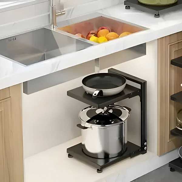 Αυτό το ράφι αξιοποιεί αποτελεσματικά τον χώρο μέσα στα ντουλάπια της κουζίνας, ενισχύοντας την οργάνωση και τη λειτουργικότητα της κουζίνας.