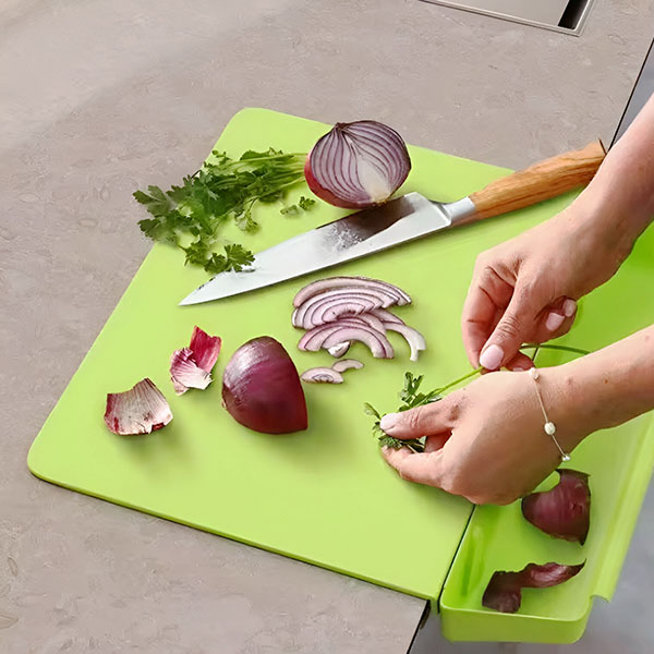 Διατηρήστε την κουζίνα σας τακτοποιημένη και αποτελεσματική! 🍅🍴 Το αποσπώμενο δοχείο αυτής της επιφάνειας κοπής πιάνει όλα τα ψιλοκομμένα συστατικά σας, κάνοντας την προετοιμασία του γεύματος παιχνιδάκι και εξοικονομώντας χρόνο καθαρισμού. 🧽✨ Πείτε αντίο στην ακαταστασία στον πάγκο εργασίας!