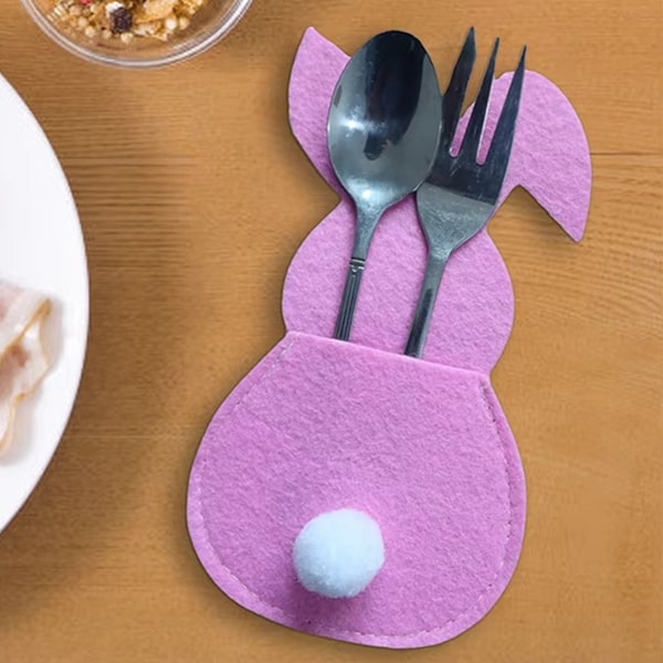 Υλικό: Υψηλής ποιότητας τσόχα Μέγεθος: 15 x 8,5 εκ. Χρώματα: Μπλε, ροζ, κίτρινο και μοβ Περιλαμβάνει: 4 x Θήκες μαχαιροπήρουνων σε σχήμα λαγού